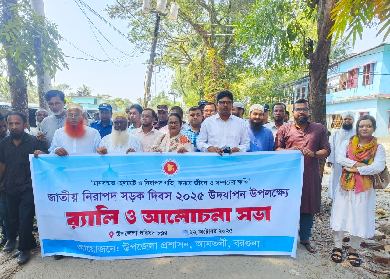 বুধবার সকাল সাড়ে ১০টায় জাতীয় নিরাপদ সড়ক দিবস পালন উপলক্ষে উপজেলা পরিষদ চত্ত্বর থেকে এক বর্নাঢ্য র্যালি বের হয়ে শহর প্রদক্ষিণ করে। পরে উপজেলা পরিষদের হল রুমে এক আলোচনা সভা অনুষ্ঠিত হয়। আমতলী উপজেলা নির্বাহী অফিসার মো. রোকনুজ্জামান খান এর সভাপত্বি অনুষ্ঠিত আলোচনা সভায় বক্তব্য রাখেন আমতলী উপজেলা সহকারী কমিশনার (ভূমি) মো. আশরাফুল ইসলাম, কৃষি কর্মকর্তা মো. রাসেল, ওসি তদন্ত মো. সাইদুল ইসলাম, ট্রাফিক পুলিশ পরিদর্শক মো. সোয়েবুল ইসলাম, সাংবাদিক জাকির হোসেন, প্রেসক্লাব সভাপতি রেজাউল করিম, পৌর বিএনপির সম্পাদক মো. জালাল আহম্মেদ খান, এনসিপির উপজেলা সভাপতি মো. বায়েজিদ ইসলাম প্রমুখ।